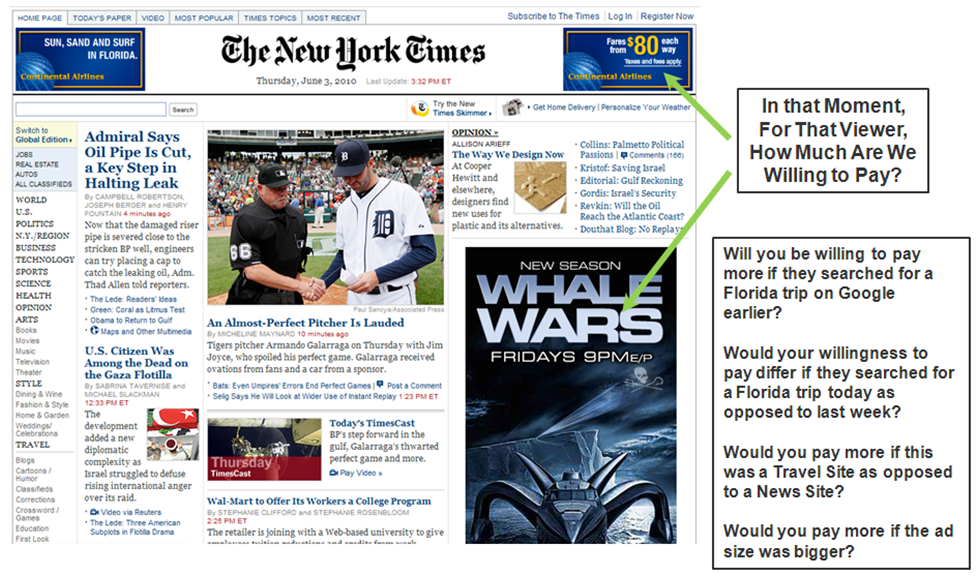 Therefore the willingness Coca Cola would have to pay would be based solely on some historical metrics they have internally as it relates to the value of that form of advertising and how all Bloomberg.com demographic viewers would match their desired audience (i.e. very similar to the way TV ads have traditionally been negotiated and purchased). Now assume Pepsi goes to Bloomberg and undertakes a similar process and they value the ads on Bloomberg at a similar level as Coca Cola. Clearly some major in-efficiencies are going to exist;